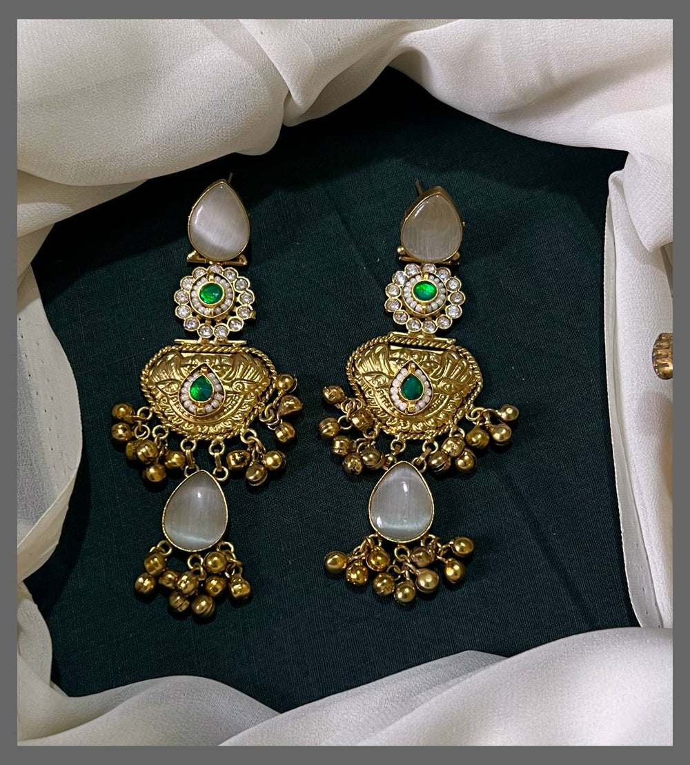 Exquisite Designer Jadau Earrings featuring traditional craftsmanship with meticulous attention to detail. These statement pieces blend timeless Jadau technique with contemporary design elements, creating versatile accessories suitable for both festive occasions and elegant gatherings. The intricate metalwork and premium materials ensure durability while maintaining authentic artisanal quality.