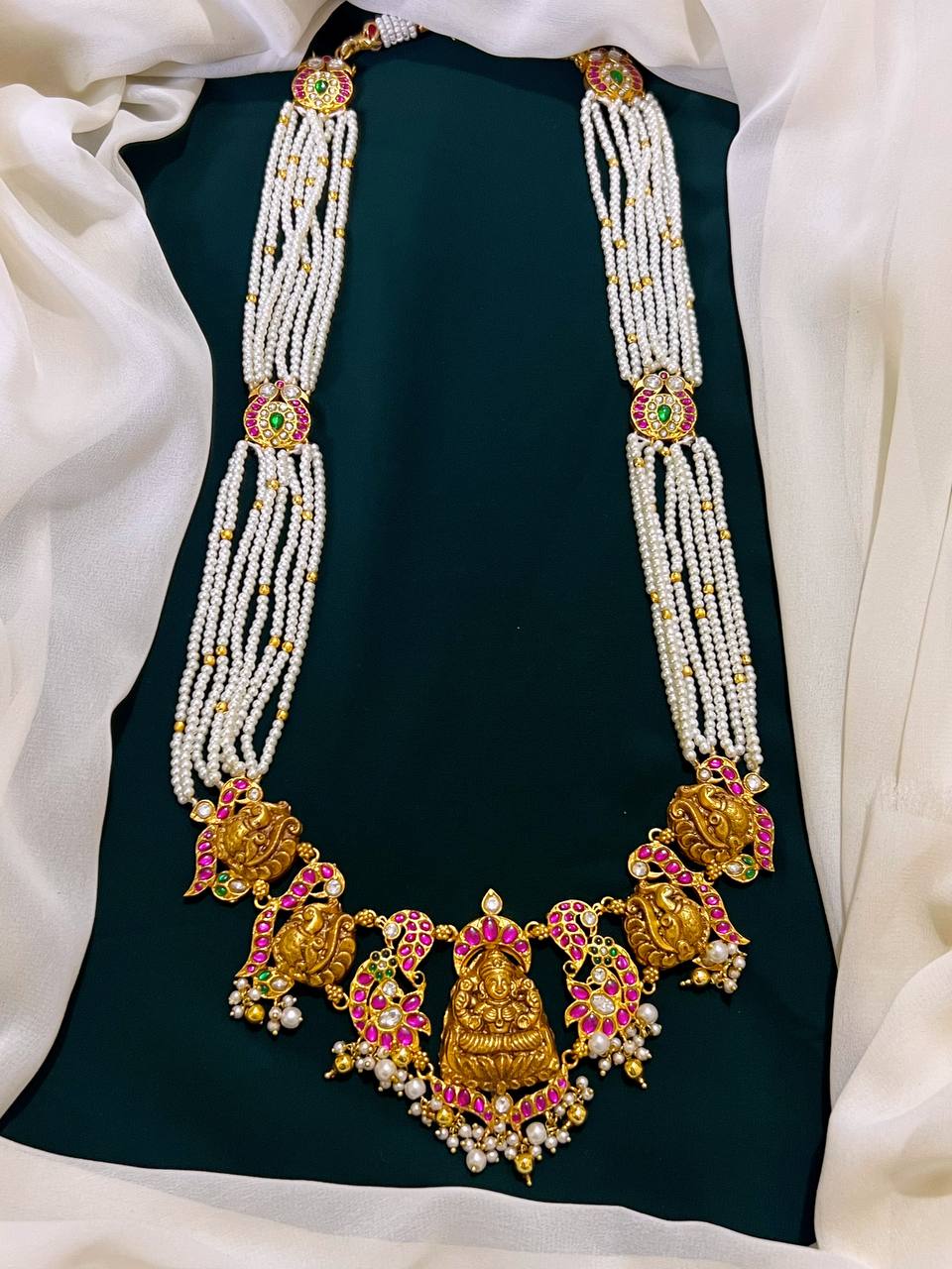 Elevate your accessory collection with this exquisite Beautiful Antique finish Devi and peacock with white pearls in Jadav Kundan adorned with intricate JADAV KUNDAN workmanship. This stunning piece combines elegance and tradition, making it a perfect addition to any outfit, whether for a special occasion or everyday wear.