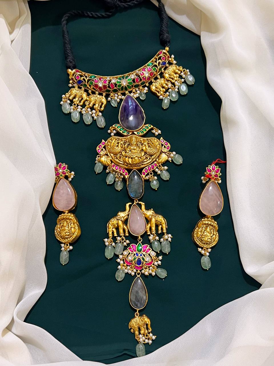 Elevate your accessory collection with this exquisite Devi pendent with peacock and Elephant in Black Dori Kundan with Earring adorned with intricate Kundan craftsmanship. This stunning piece combines elegance and tradition, making it a perfect addition to any outfit, whether for a special occasion or everyday wear.