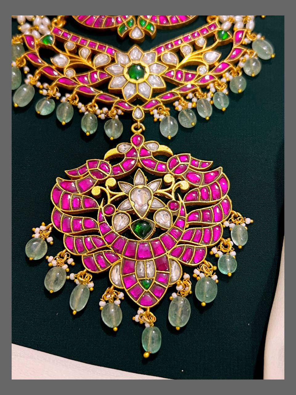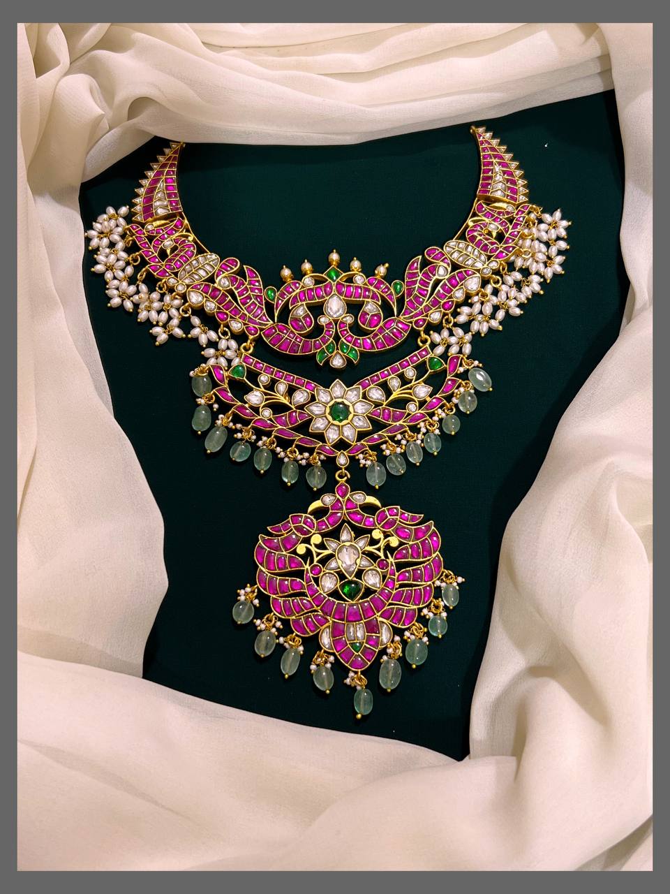 This Double Layer Kundan Haram with Pendent combines traditional elegance with intricate craftsmanship. Featuring two layers of beautifully set Kundan stones, it adds depth and richness to your look. The matching pendent enhances its charm, making it perfect for special occasions or festive celebrations. Designed to complement a variety of outfits, this haram offers a timeless appeal that supports your style with grace and sophistication.