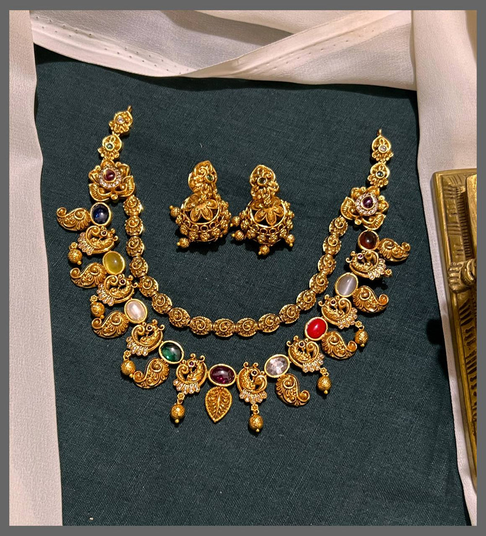 Elevate your jewelry collection with this stunning double layer necklace, a masterpiece of traditional craftsmanship. Featuring intricate Nakshi work adorned with a graceful peacock motif and vibrant multi-stone embellishments, this piece seamlessly blends heritage artistry with contemporary elegance. The dual-layer design creates beautiful depth and dimension, making it perfect for both festive occasions and everyday sophistication. Each detail is carefully crafted to ensure lasting beauty and timeless appeal. A versatile treasure that celebrates the artistry of fine jewelry.
