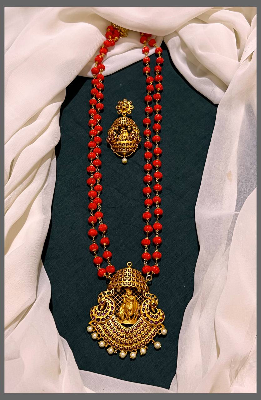 Embrace divine elegance with this stunning double layer pendant featuring lustrous pearls and vibrant rubies, crowned with a graceful Krishna motif. The harmonious blend of precious gemstones creates a piece that celebrates both spiritual significance and timeless beauty. Perfect for those seeking meaningful jewelry that connects tradition with refined style, this pendant works beautifully as a daily reminder of grace or a cherished gift for someone special. The layered design adds depth and dimension, making it a versatile addition to any collection.