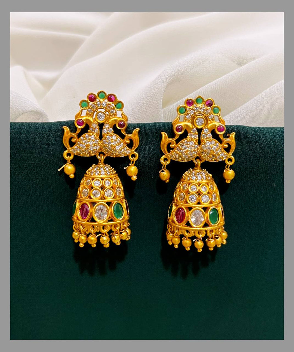Celebrate tradition with the Double Peacock Multi-Color Jhumki in Nakshi design. This exquisite earring features intricate craftsmanship and vibrant colors that enhance any outfit. Perfect for festive occasions or daily wear, it adds a touch of elegance and cultural charm to your look. Comfortable to wear and designed to complement various styles, these jhumkis are a beautiful addition to your jewelry collection.