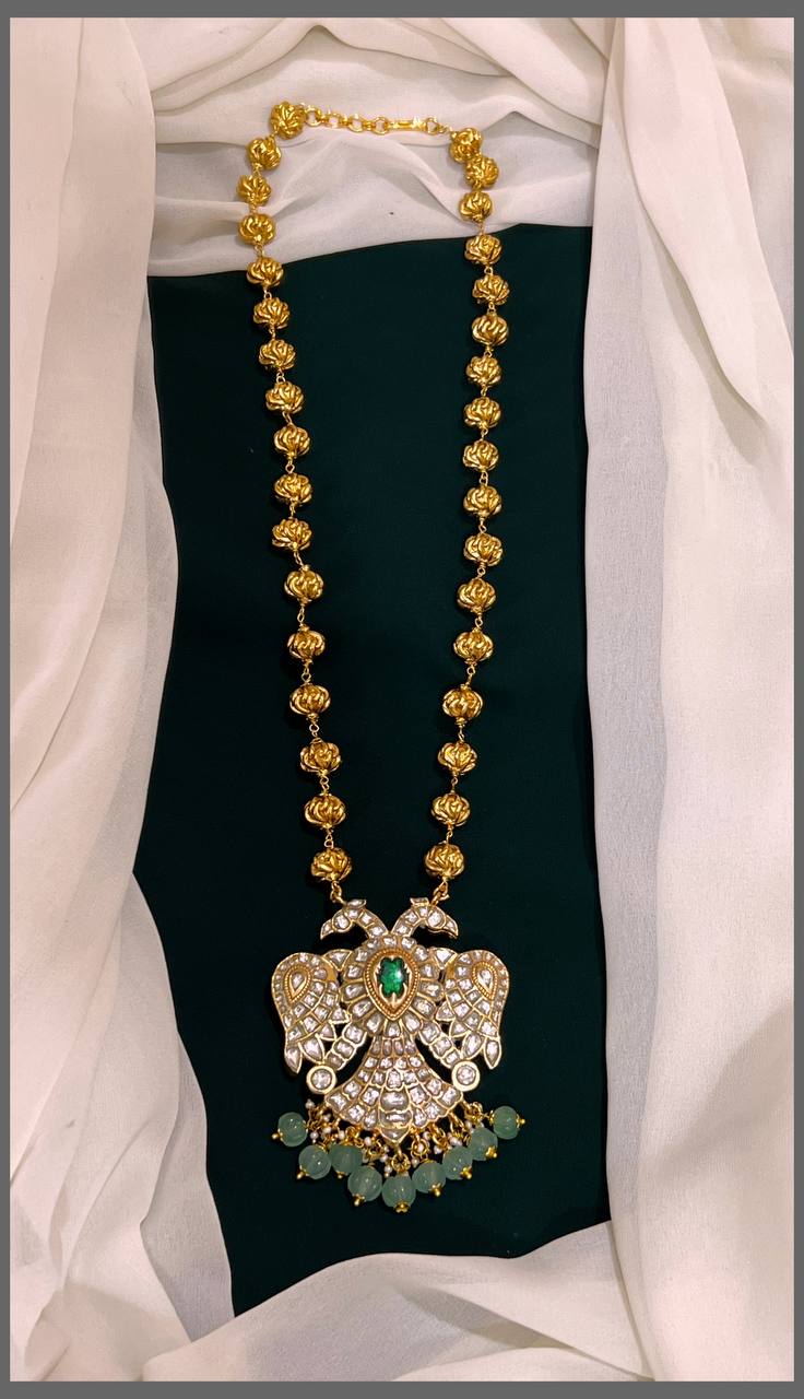 The Double Sided Gandaberunda With Nakshi Ball - KH00285 is a finely crafted piece that showcases intricate artistry on both sides, featuring the mythical Gandaberunda design paired with a detailed Nakshi ball. This unique combination not only adds visual depth but also offers versatile styling options, making it a meaningful addition to your collection. Its detailed craftsmanship supports your desire for elegant and culturally rich jewelry.