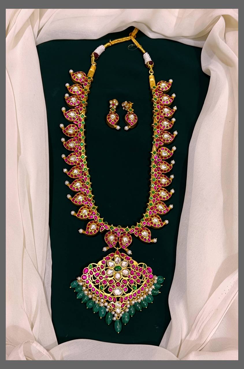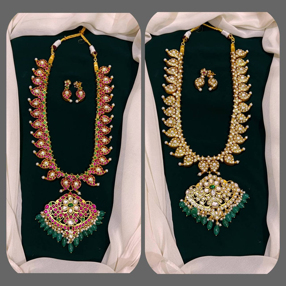 This Double Sided Mango Haram set, complete with matching earrings, offers a unique blend of traditional charm and elegant design. Crafted to enhance your festive or special occasion attire, its detailed mango-shaped motifs add a distinctive appeal. The earrings perfectly complement the necklace, making it an ideal choice to elevate your jewelry collection with style and grace.