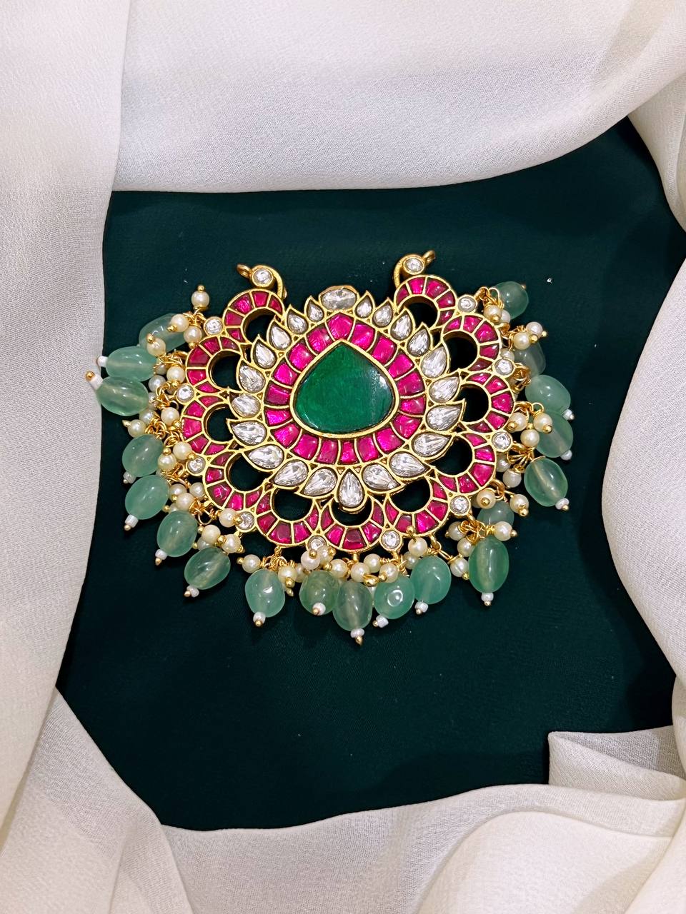 Elevate your accessory collection with this exquisite Dew Dropes in Jadau Kundan Pendent adorned with intricate Kundan workmanship. This stunning piece combines elegance and tradition, making it a perfect addition to any outfit, whether for a special occasion or everyday wear.