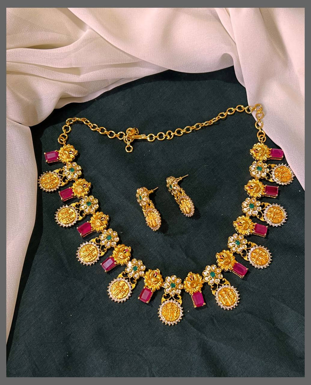 Celebrate divine elegance with this exquisite Nakshi necklace, where intricate floral motifs dance alongside the sacred Lakshmi Kashu pendant. Each detail is meticulously crafted using traditional Nakshi techniques, creating a piece that honors both artistry and spirituality. Perfect for festivals, weddings, or everyday wear, this necklace brings timeless grace and cultural richness to your jewelry collection. A meaningful accessory that connects you to heritage while elevating your personal style.