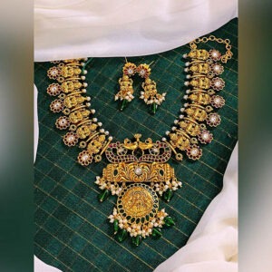 Elegant Kante Laxmi Set with Earrings Features: Color: Golden Style: Round Pendant Necklace Material: Brass Earrings: Yes Experience: Lightweight and comfortable to wear Usage: Great for an everyday celebration