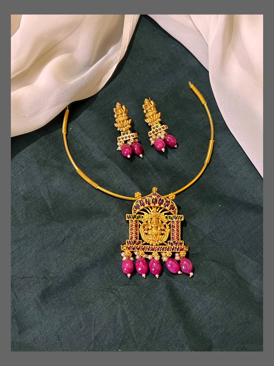 Celebrate divine grace with this exquisite Lakshmi Pendant Chokar, crafted in traditional Nakshi technique. This elegant piece features intricate detailing that captures the essence of prosperity and abundance. The pendant showcases fine craftsmanship with delicate patterns, making it a meaningful addition to your jewelry collection. Perfect for festive occasions, religious ceremonies, or everyday wear, this choker-style pendant brings timeless beauty and spiritual significance. Wear it as a symbol of blessings and elegance.