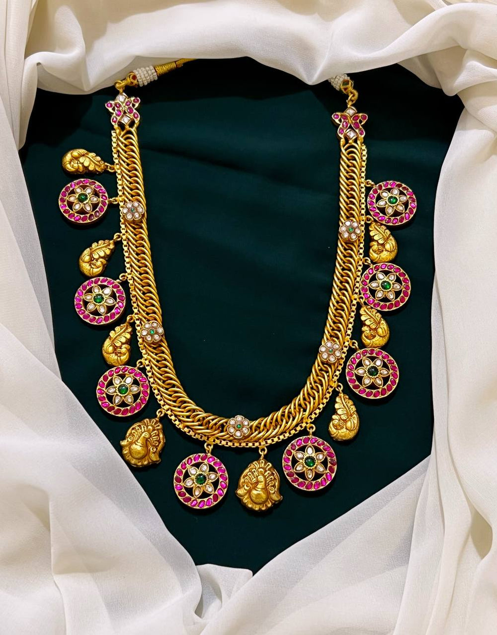 This Elegant Peacock Bottu Mala in Kundan Haram is a stunning piece of jewelry that features intricate kundan work and a unique peacock design. Made with high-quality materials, it is a luxurious choice for any special occasion. Add an elegant touch to your outfit and make a statement with this beautiful necklace.
