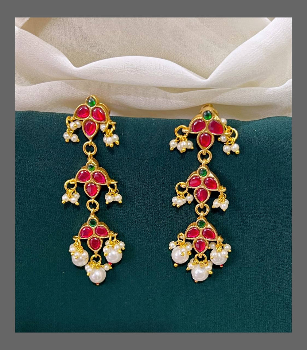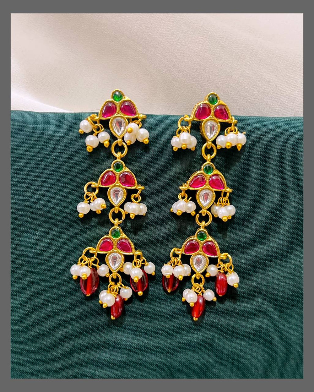These exquisite earrings feature vibrant emerald and ruby stones set in traditional Kundan craftsmanship. Their rich colors and intricate design add a touch of elegance to any outfit, making them perfect for special occasions or enhancing your everyday style with a classic charm. Comfortable to wear and beautifully crafted, they bring timeless beauty and a sense of confidence to your jewelry collection.