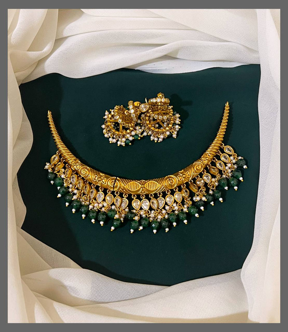 Elevate your traditional attire with our exquisite Emerald Beads necklace featuring elegant Kante work and matching Jhumkis. This handcrafted set combines classic design with contemporary styling, perfect for weddings, festivals, and special occasions. The vibrant Emerald bead pattern creates a stunning focal point that beautifully complements ethnic wear.