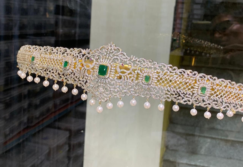 Beautiful Emerald Daimond Adult Waist Belt, in gold finish with Pearls downside