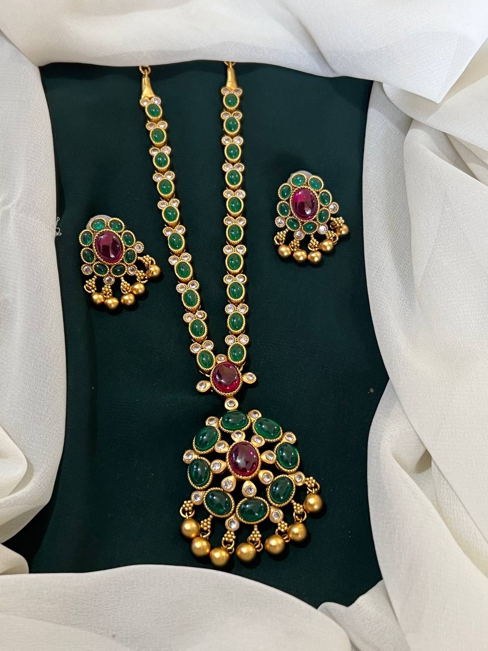 Adorn yourself with this exquisite Emerald Flower Necklace featuring intricate Nakshi work. The delicate flower design showcases vibrant emerald stones that complement the traditional craftsmanship. Perfect for special occasions, this timeless piece adds a touch of elegance to both contemporary and traditional outfits.