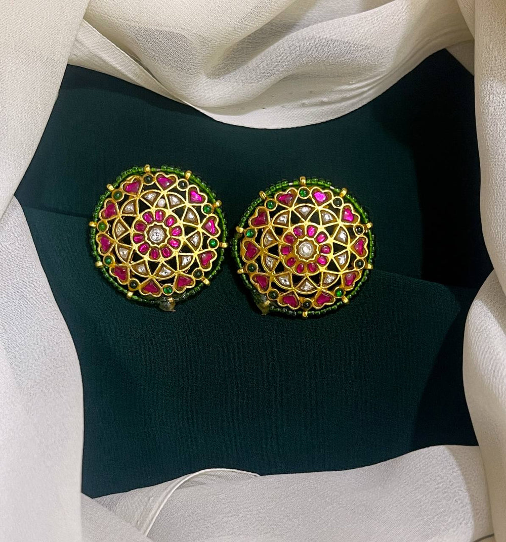Introducing the Emerald Jadau Kundan Studs - KE00130, featuring exquisite emerald gemstones and traditional Kundan setting. These studs come with a secure back screw for comfortable wear. Elevate any outfit with the radiant beauty and craftsmanship of these earrings.