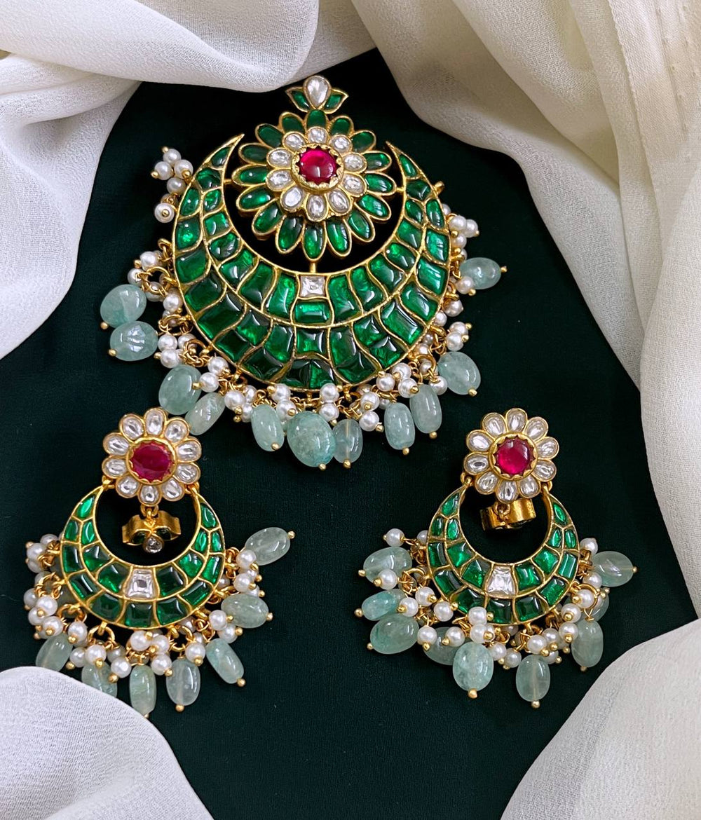 Grand Beautiful Emerald kundan pendant with back hook and pair of earrings