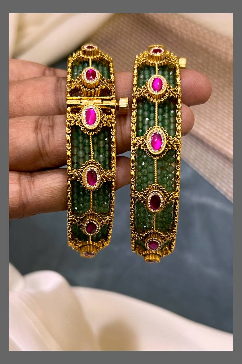 Elevate your elegance with the Emerald Jadau Screw Open Bangles - BG00121. These beautifully crafted bangles feature vibrant emerald stones set in traditional jadau work, offering a secure screw-open design for easy wear and removal. Perfect for adding a touch of timeless charm to any outfit, they combine comfort with classic style, making them a supportive choice for your jewelry collection.