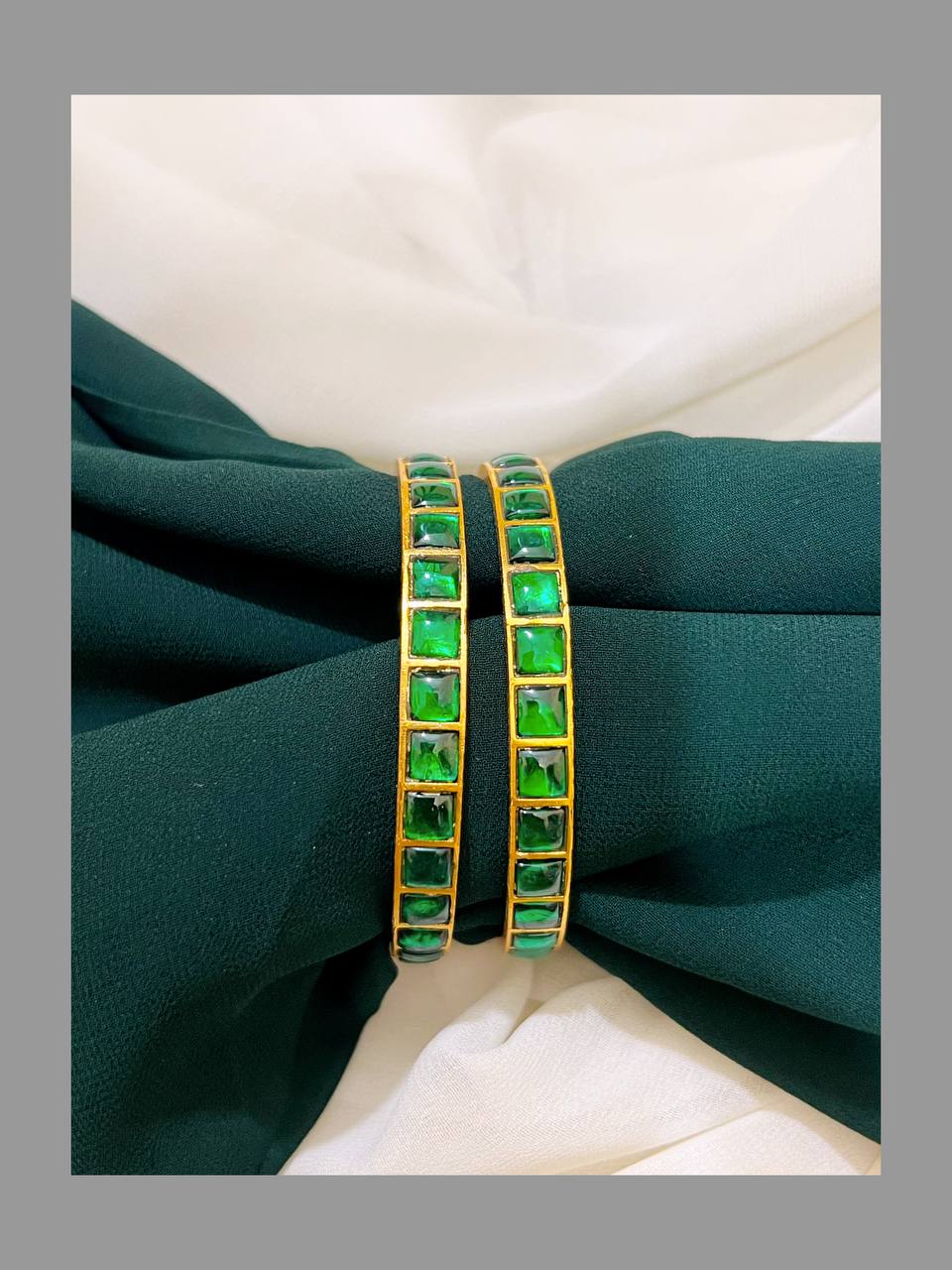 Expertly crafted with sparkling emerald stones and intricate kundan work, these bangles are a timeless addition to any traditional ensemble. The vibrant green of the emeralds brings a touch of nature's beauty, while the precise detailing of the kundan adds an element of luxury and sophistication.