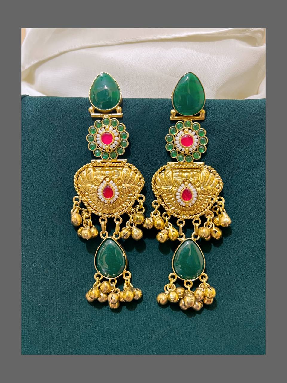 Exquisite Emerald Kundan Long Earrings featuring traditional craftsmanship with vibrant green stones set in meticulous Kundan work. These statement pieces combine classical Indian artistry with contemporary elegance, perfect for elevating festive attire, wedding ensembles, or adding sophistication to formal occasions. The elongated design creates a flattering silhouette that frames the face beautifully.