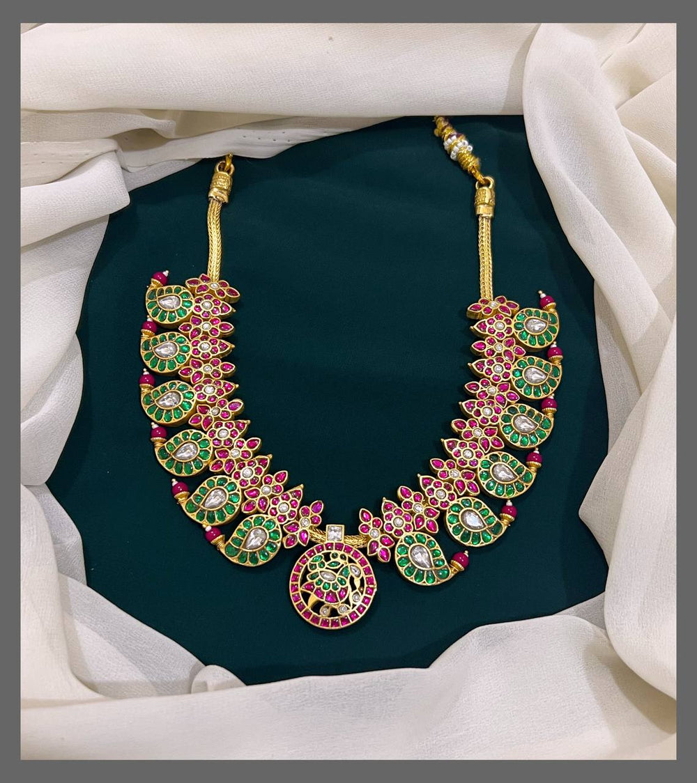 This elegant emerald mango chain features a delicately crafted small peacock pendant in traditional Kundan style. Perfectly blending classic artistry with a touch of vibrant color, it adds a graceful charm to any outfit. Crafted to offer both beauty and durability, this piece makes a thoughtful gift or a timeless addition to your jewelry collection.