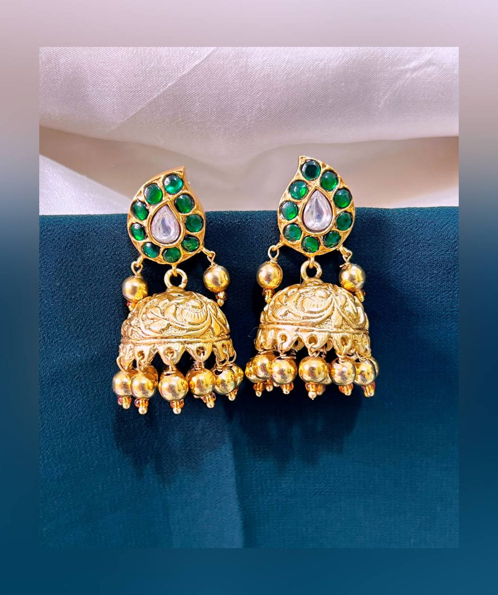 This Emerald Mango Jimikki in Kundan - KE00158 is a stunning and intricate piece of Indian jewelry. With its vibrant emerald green mango design and sparkling Kundan crystals, it is sure to add a touch of elegance and sophistication to any outfit. The perfect statement piece for any occasion.