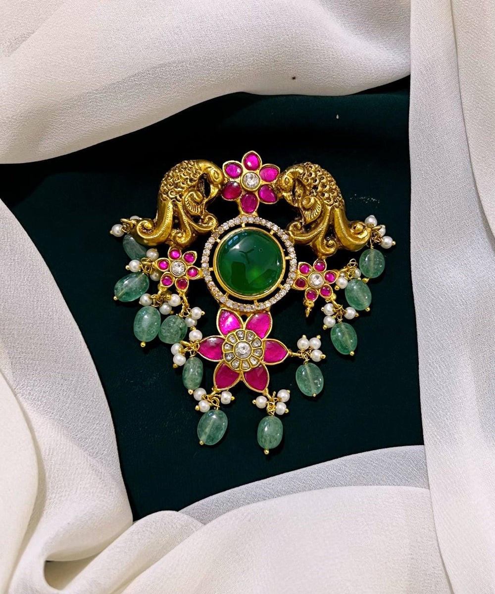 This elegant Emerald Peacock Pendent in Kundan - KP0094 showcases fine craftsmanship and intricate design. Made with high-quality emerald and Kundan details, this pendent is the perfect accessory to elevate any outfit. Impressive and unique, it will surely make a statement and bring a touch of luxury to your look.