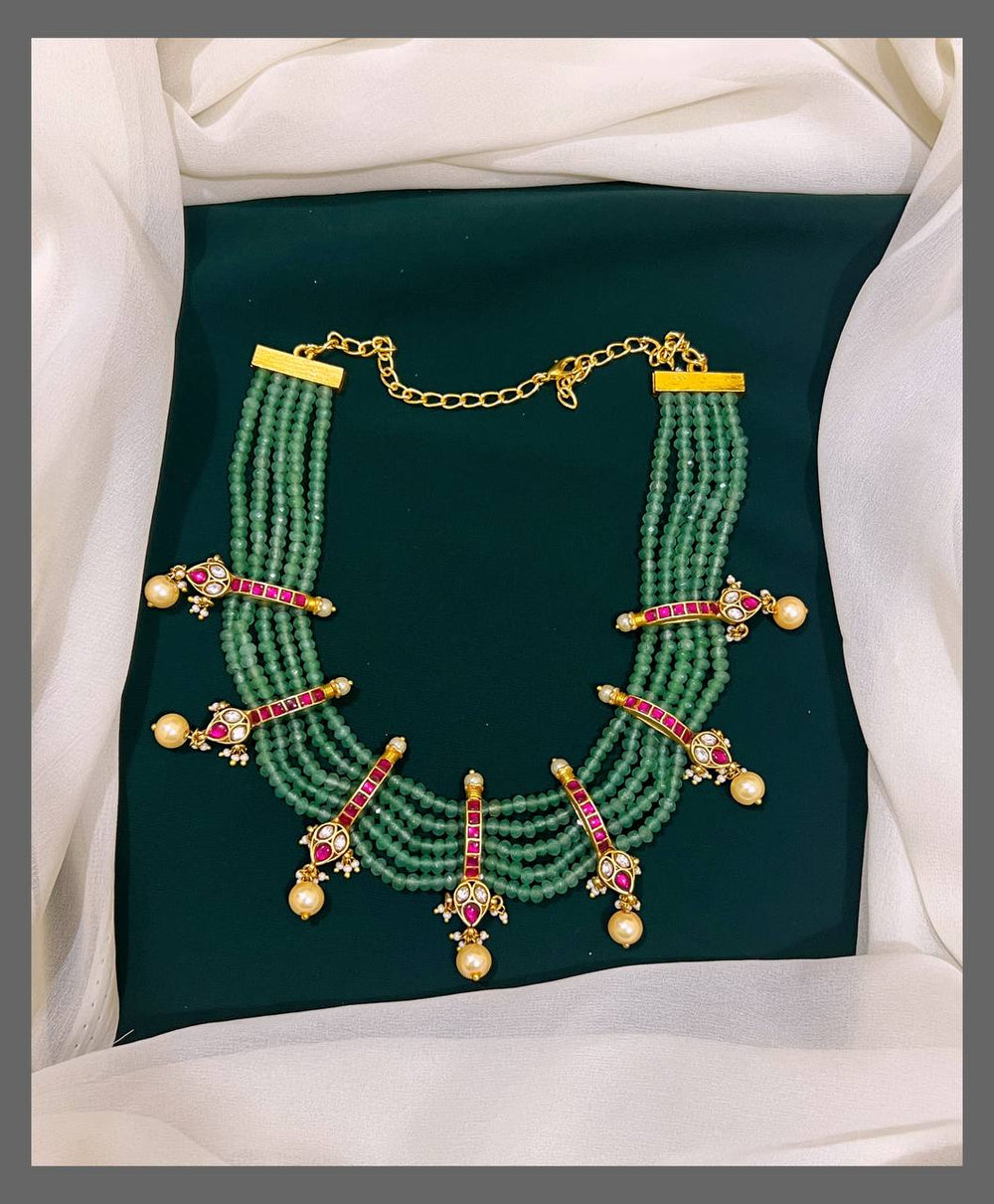 Adorn yourself with this exquisite Emerald Pearl Necklace featuring intricate Kundan work. The harmonious blend of lustrous pearls and vibrant emerald stones creates a timeless piece that elevates both traditional and contemporary outfits. Perfect for special occasions, this necklace adds a touch of royal elegance to your jewelry collection.