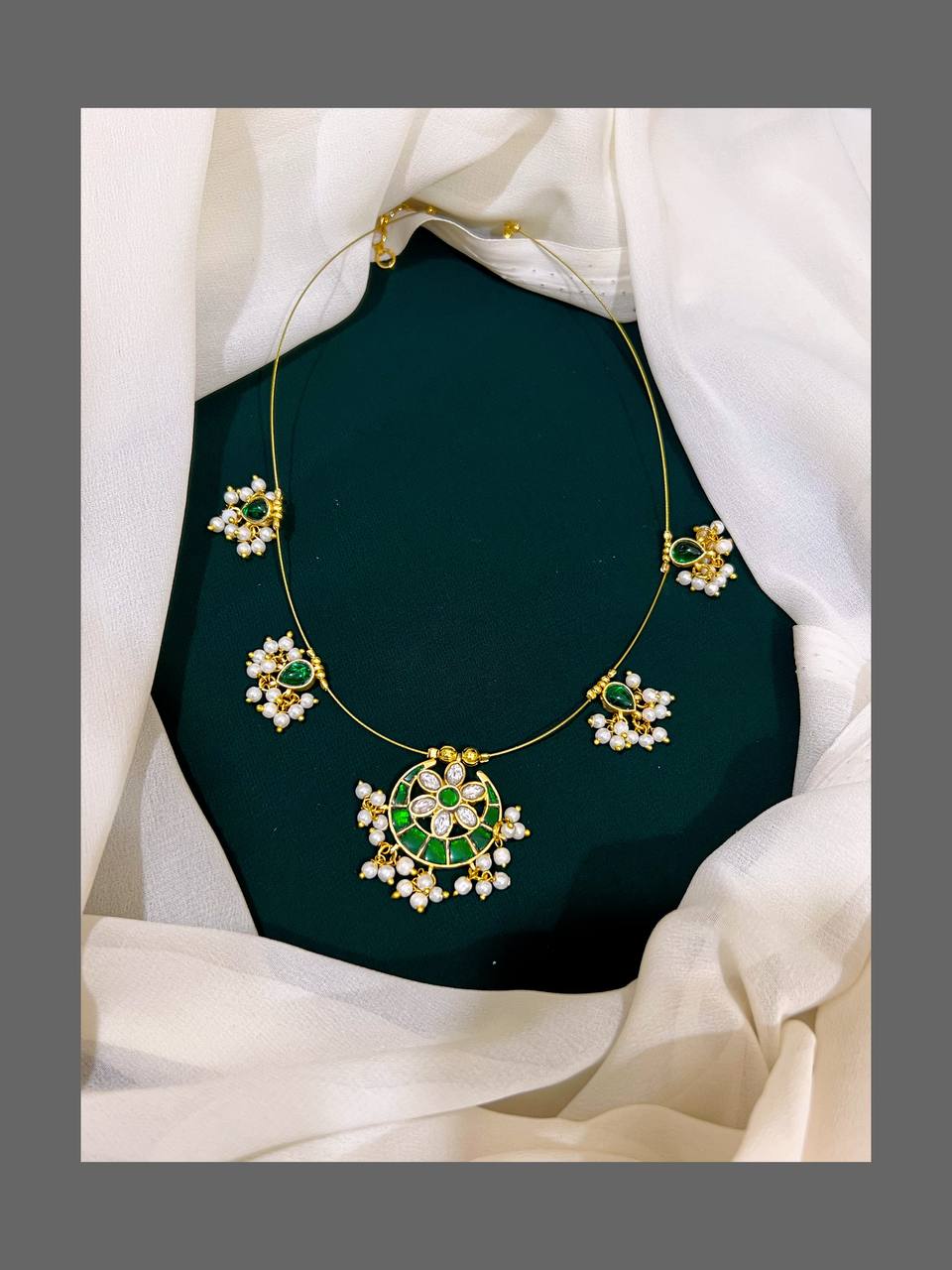 Enhance your jewelry collection with our Emerald Small Chand bail necklace in Kundan. Made with the finest quality materials, this necklace radiates elegance and sophistication. The Kundan design adds a touch of traditional beauty, making it perfect for any occasion. Elevate your style and make a statement with this stunning necklace.