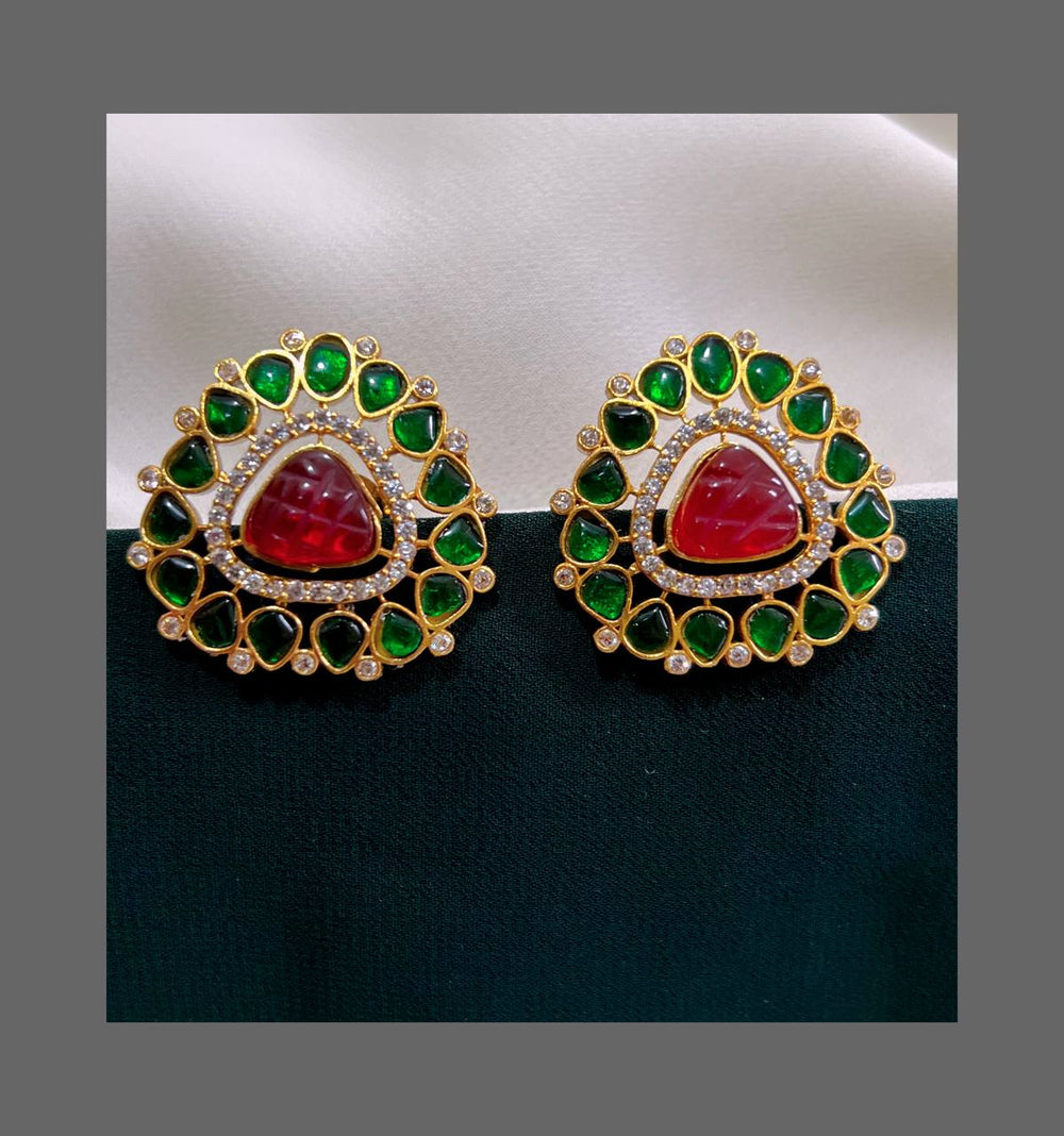 Exquisite Kundan stud earrings featuring premium emerald stones set in traditional craftsmanship. The intricate Kundan work showcases meticulous artistry, creating a perfect balance of elegance and cultural heritage. These lightweight studs offer versatile styling for both everyday wear and special occasions.