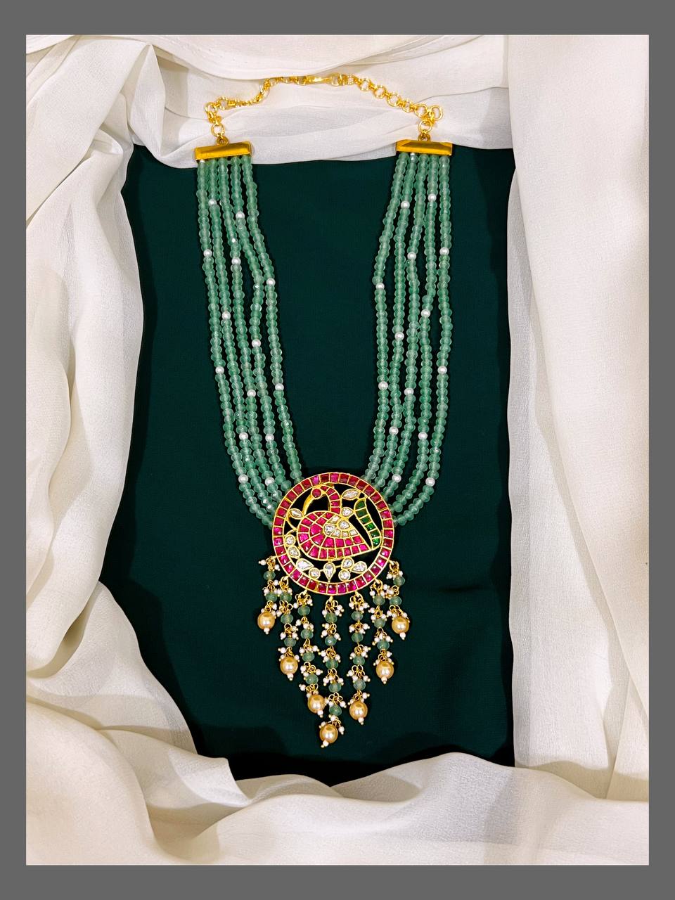 Elevate your collection with the Emerald Swan Kundan Necklace - KN00341, a masterful blend of traditional craftsmanship and elegant design. Featuring meticulously set kundan stones complemented by vibrant emerald accents, this necklace showcases a graceful swan motif symbolizing beauty and purity. Perfect for special occasions, it offers a refined statement piece that enhances any ensemble with timeless sophistication. Crafted to expert standards, it ensures both durability and exquisite detail.