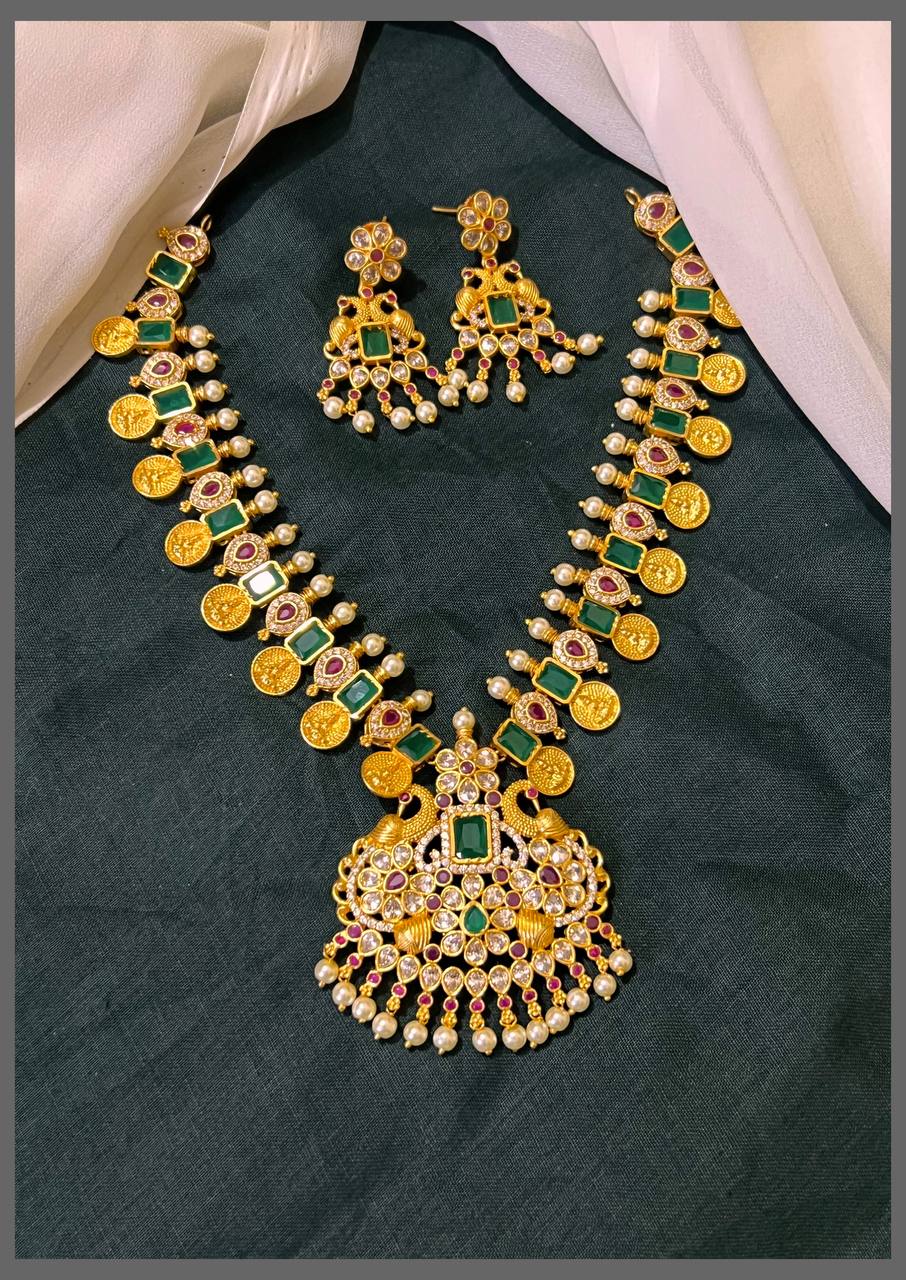 Embrace divine elegance with this exquisite Emerald pendant necklace, featuring intricate Nakshi craftsmanship. The design beautifully combines a lustrous emerald stone with delicate Kashu and Lakshmi motifs, symbolizing prosperity and spiritual grace. Each piece is meticulously handcrafted, showcasing traditional artistry and attention to detail. Perfect for festive occasions, religious ceremonies, or everyday wear, this necklace adds a touch of timeless sophistication to your jewelry collection. A meaningful investment that celebrates both beauty and cultural heritage.