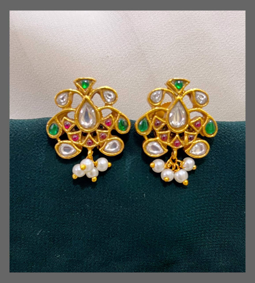 These elegant Kundan earrings feature a delicate flower design adorned with sparkling white stones and lustrous pearls. Perfect for adding a touch of traditional charm to any outfit, they offer a graceful blend of classic beauty and refined craftsmanship. Ideal for special occasions or everyday wear, these earrings enhance your look with subtle sophistication.