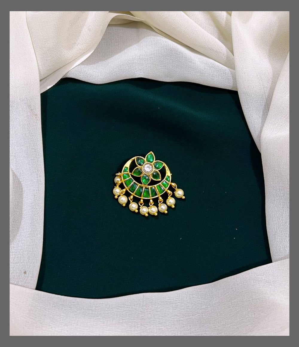 This exquisite Flower in Chandbali pendant crafted in Kundan showcases intricate artistry and timeless elegance. Its delicate floral design adds a graceful touch to any outfit, making it perfect for special occasions or everyday wear. The traditional Kundan work ensures a radiant shine, enhancing your natural beauty with every wear. A meaningful addition to your jewelry collection that supports your style with charm and sophistication.