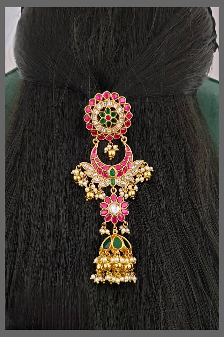 Enhance your traditional look with the Flower Kundan Jada Billa adorned with elegant pearls. This exquisite piece beautifully combines intricate kundan work with delicate pearls, adding a touch of sophistication to any ensemble. Perfect for special occasions, it offers a graceful and timeless charm that complements your festive attire effortlessly.