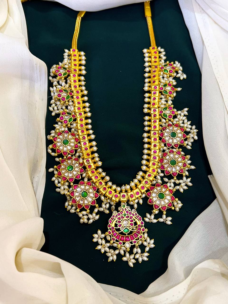 Elevate your accessory collection with this exquisite Flower Rice Pearl Haram in Jadau Kundan with Pendent adorned with intricate JADAV KUNDAN workmanship. This stunning piece combines elegance and tradition, making it a perfect addition to any outfit, whether for a special occasion or everyday wear.