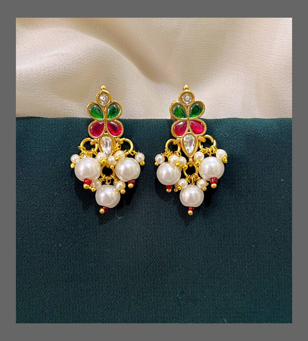 These elegant Flower with White Pearl Earrings in Kundan craftsmanship blend traditional charm with timeless beauty. Featuring delicate floral designs accented by lustrous white pearls, they add a graceful touch to any outfit. Perfect for special occasions or daily wear, these earrings offer a subtle yet sophisticated statement that complements your style effortlessly.