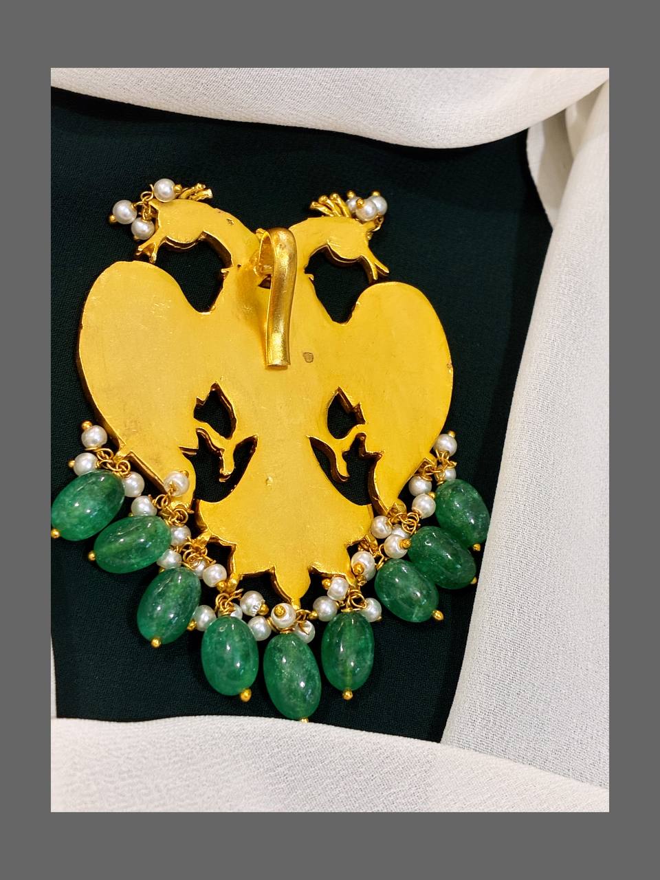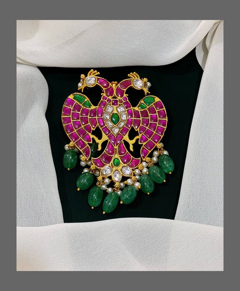 This Gandaberunda Pendant Gold Replica - KP0097 is a replica of the mythical two-headed bird of Hindu mythology. Made of gold, this pendant is a perfect representation of strength and power. A stunning piece of jewelry, it is sure to make a statement and add a touch of elegance to any outfit.