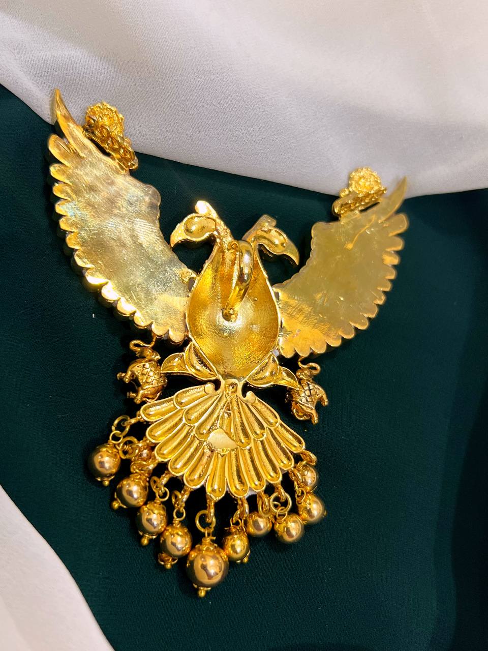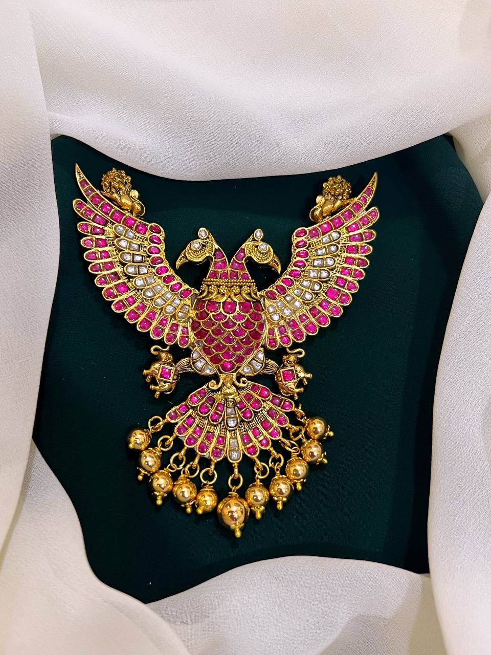 Elevate your accessory collection with this exquisite Gandaberunda Pendent In Jadau Kundan adorned with intricate Kundan workmanship. This stunning piece combines elegance and tradition, making it a perfect addition to any outfit, whether for a special occasion or everyday wear.