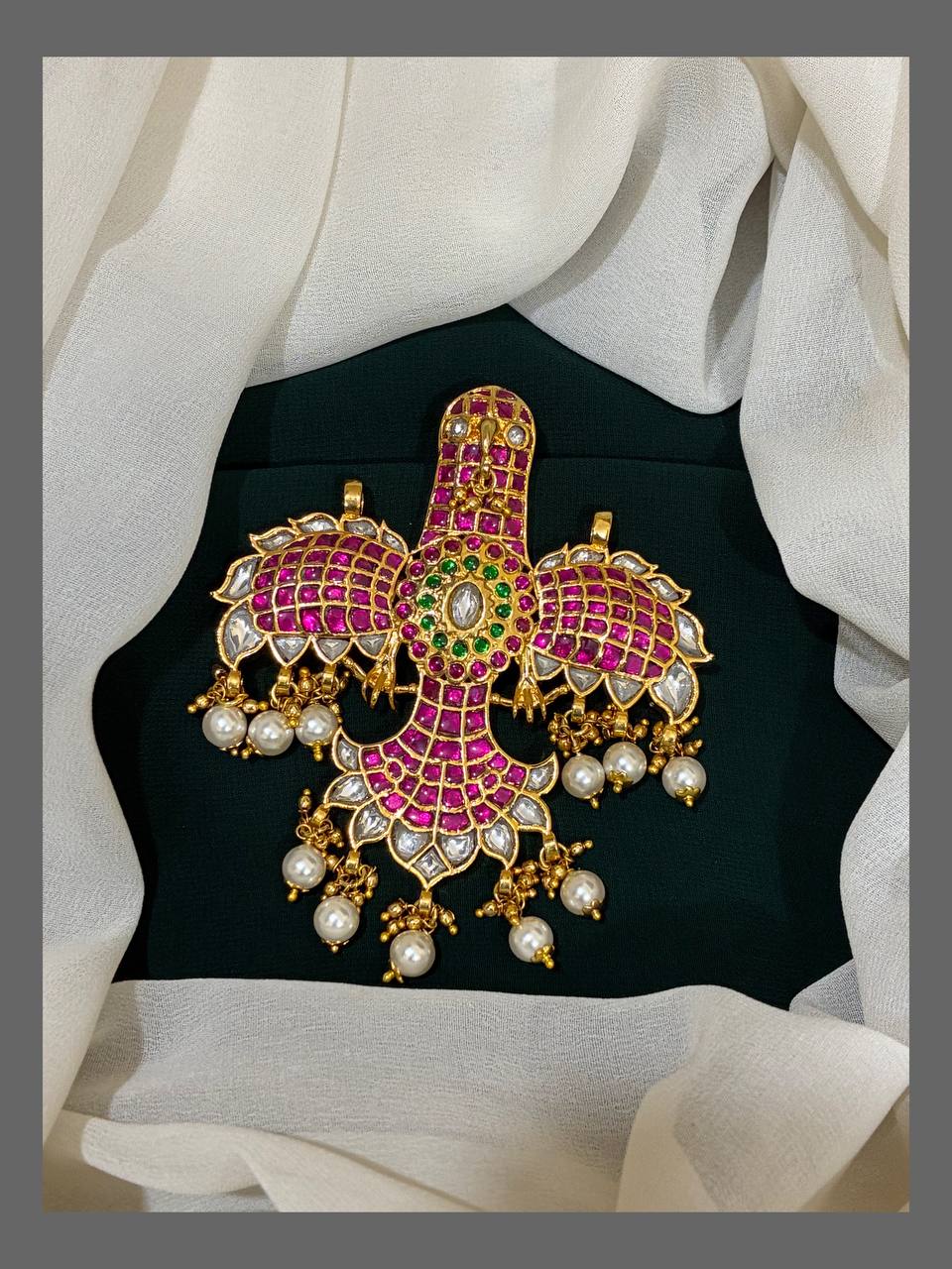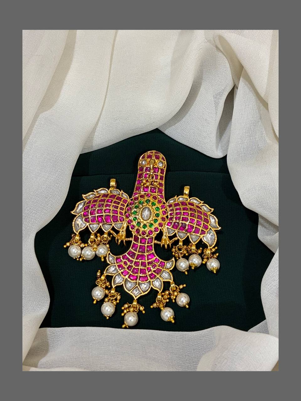 Expertly crafted, this Garuda Pendant in Kundan - KP0074 is a stunning addition to any jewelry collection. Made with precision and attention to detail, it boasts a traditional design with modern accents. The intricate Kundan work adds a touch of elegance and the Garuda motif symbolizes protection and strength. A perfect blend of tradition and style.