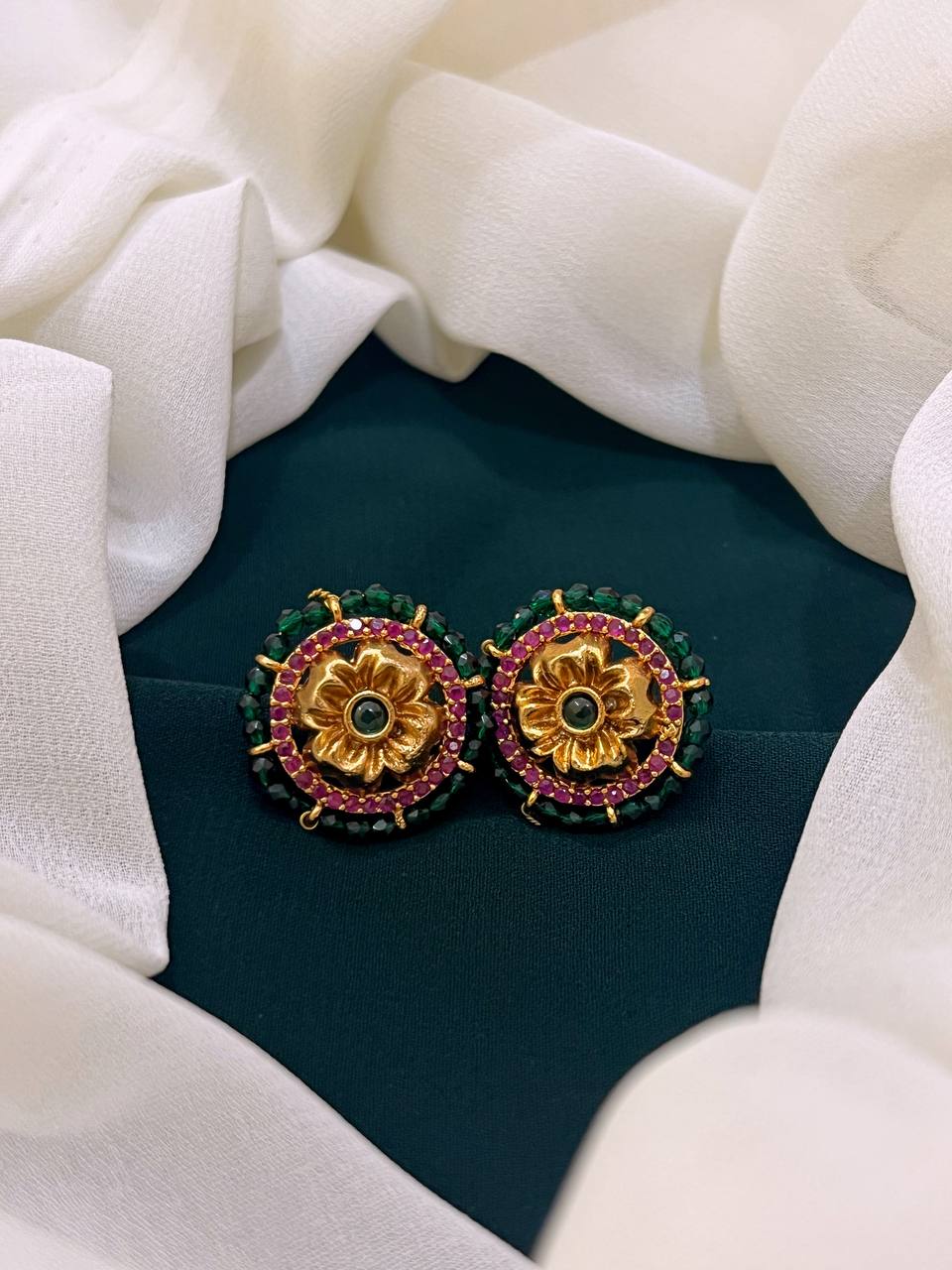 Gold Flower with Ruby Small Stone covered with Emerald Nakshi Earring , Back Push