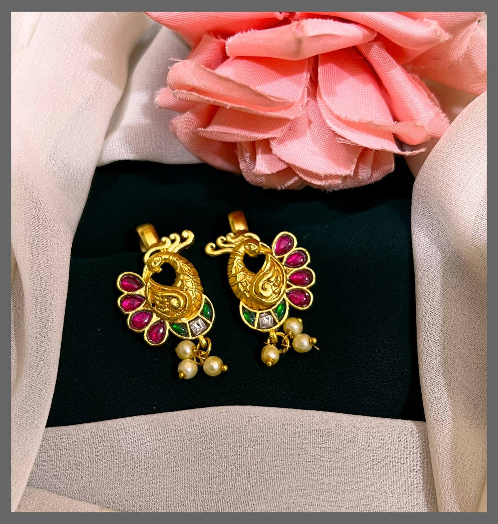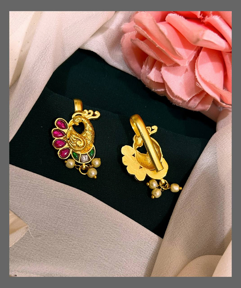This Gold Polish Peacock Bugadi in Jadau design beautifully combines traditional craftsmanship with intricate detailing. Its stunning peacock motif adds a touch of elegance, making it perfect for special occasions and cultural celebrations. The fine jadau work highlights the piece’s rich heritage, ensuring you stand out with graceful charm and classic style. Ideal for adding a timeless accent to your jewelry collection.