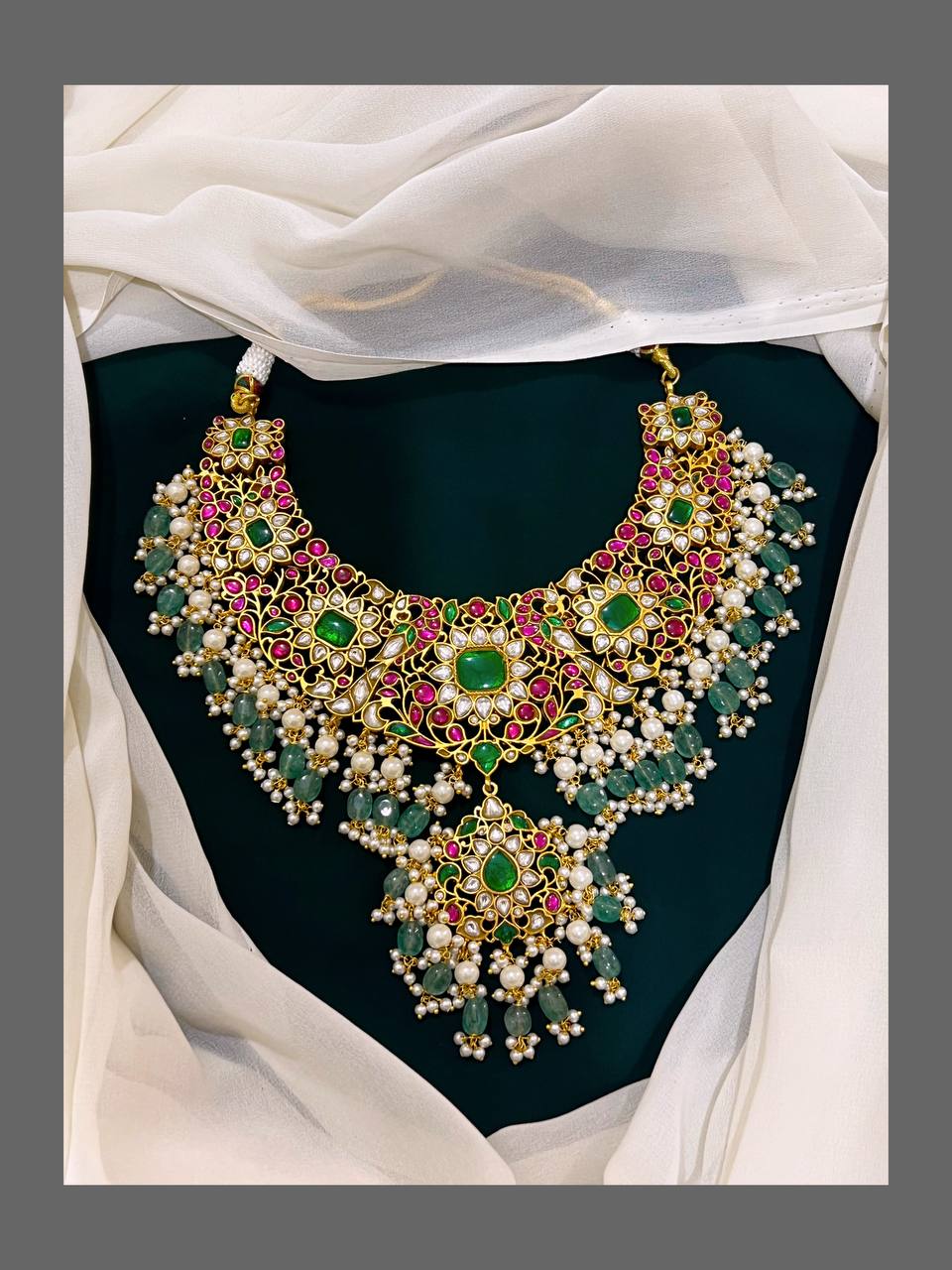 This stunning Grand Bridal Jadau Necklace features delicate Strawberry Beads, making it a one-of-a-kind piece. Perfect for any bride, this necklace adds a touch of elegance and uniqueness to your special day. Handcrafted with expert precision, this necklace exudes luxury and sophistication.
