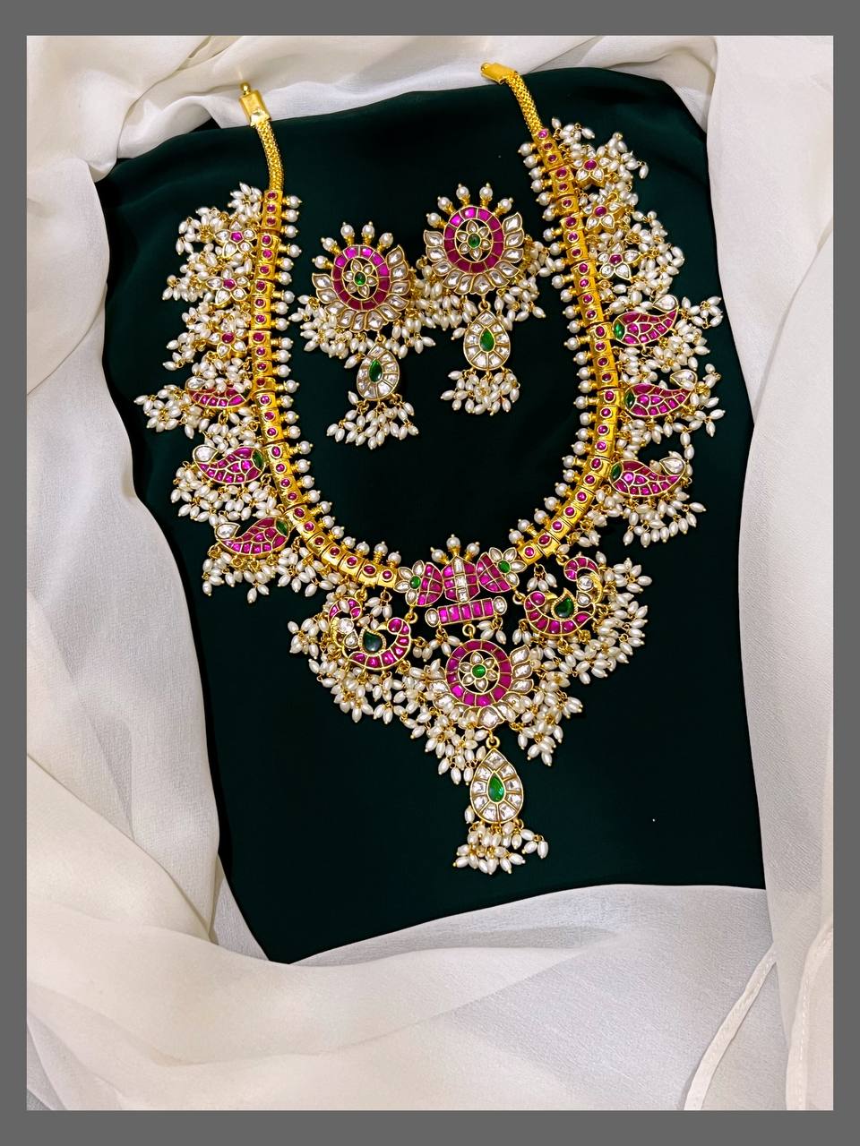 Experience the luxurious elegance of our Grand Gold Polish Guttipusalu with Earrings. This stunning set features intricate handcrafted details and a brilliant finish, perfect for any occasion. Made with high-quality materials, it exudes grace and sophistication. Elevate your look with this timeless classic.