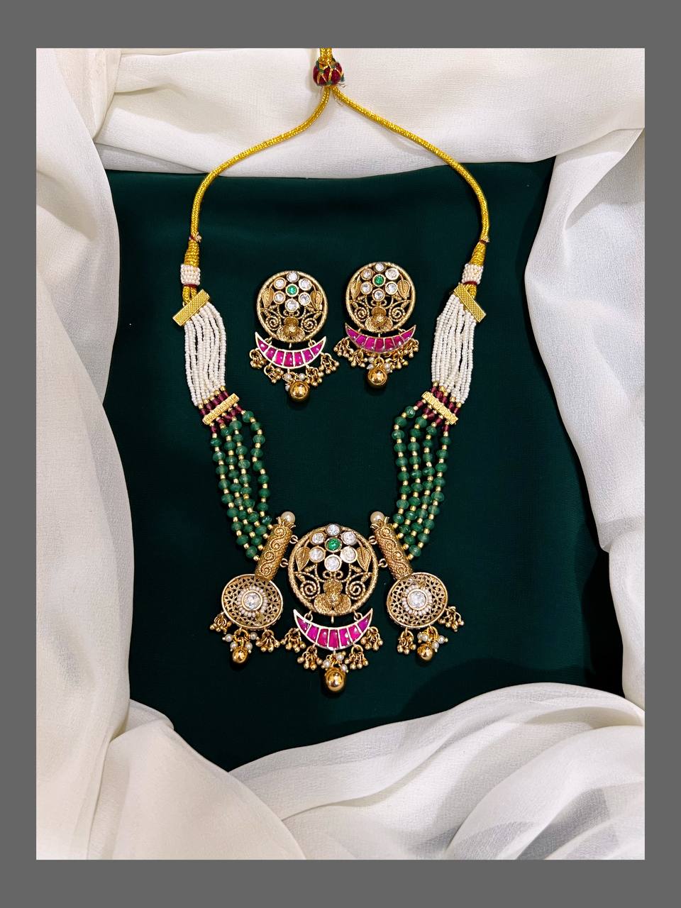 This exquisite Kundan necklace features a harmonious blend of green and white pearls, creating a timeless and elegant accessory. Perfect for enhancing traditional attire, it adds a touch of sophistication and charm to any occasion. Its intricate craftsmanship ensures you stand out with grace and style.