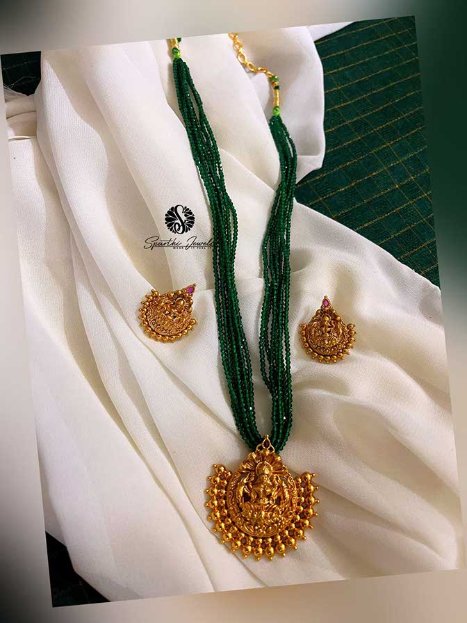 Green Beads Laxmi Necklace Features: Color: Golden, Green Style: Laxmi Pendant Material: Brass, Beads Earrings: Yes Experience: Lightweight and comfortable to wear Usage: Great for traditional events, festive seasons and party