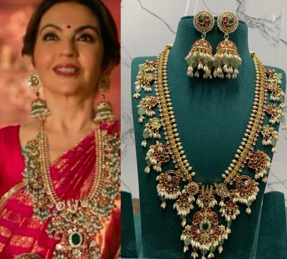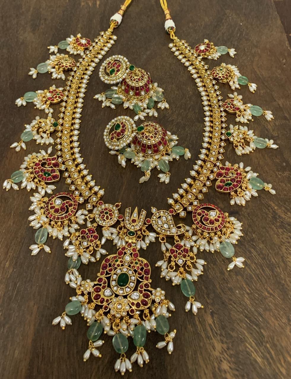 Elevate your accessory collection with this exquisite Antic Guttipusalu haram with Rice Pearl Nakshi haram with Earrings adorned with intricate NAKSHI craftsmanship.