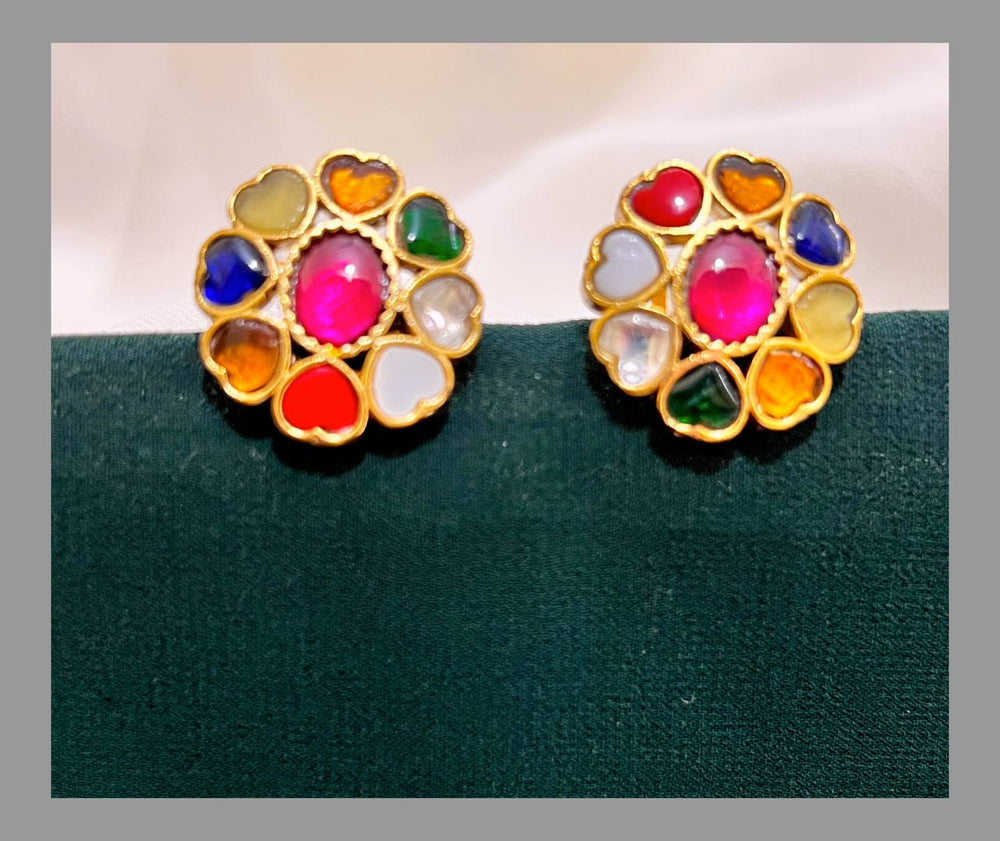 Exquisitely crafted Flower navaratna Color Stud earrings featuring premium Kundan work. These earrings showcase a delicate heart design with vibrant multi-colored stones set in traditional Kundan style, offering a perfect blend of classic craftsmanship and contemporary appeal. Ideal for both everyday elegance and special occasions.