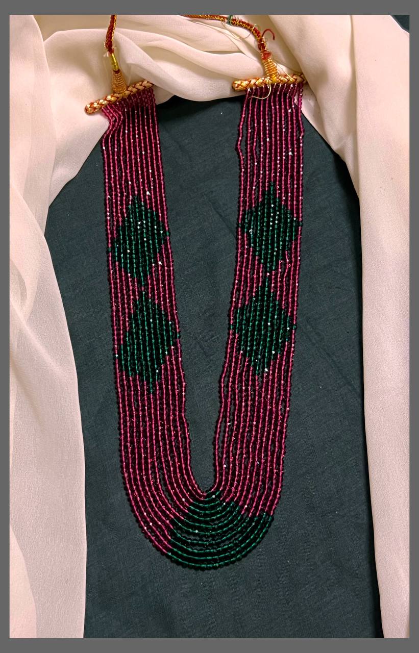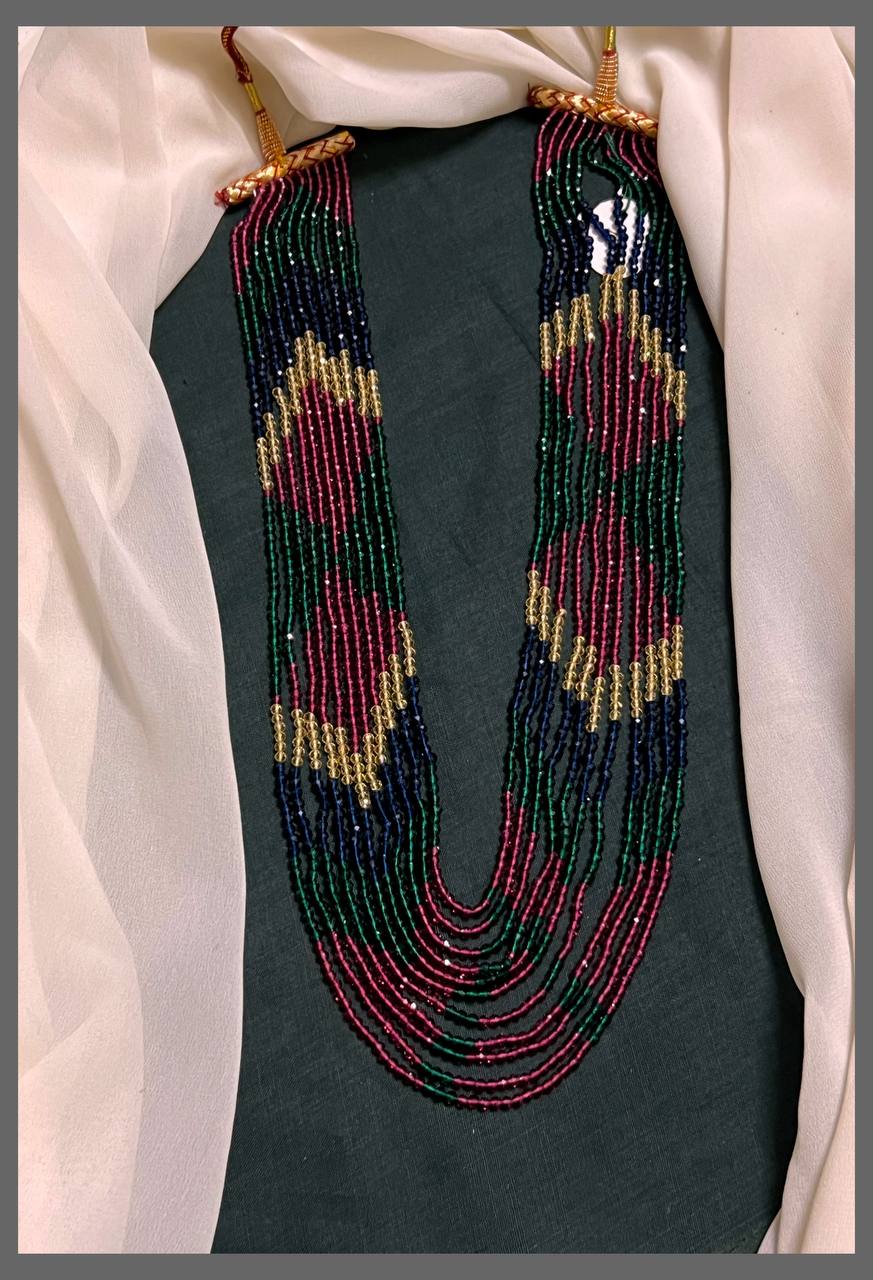 Elevate your traditional look with this stunning 10-layer crystal beads haram that brings timeless elegance to any occasion. Each delicate layer features sparkling crystal beads that catch the light beautifully, creating a radiant glow around your neck. Perfect for festivals, celebrations, or everyday wear, this piece combines classic craftsmanship with modern sophistication. The multi-layered design adds volume and presence while remaining comfortable to wear. A versatile accessory that complements both traditional and contemporary outfits, this haram is your go-to choice for adding that extra touch of glamour and grace to your ensemble.