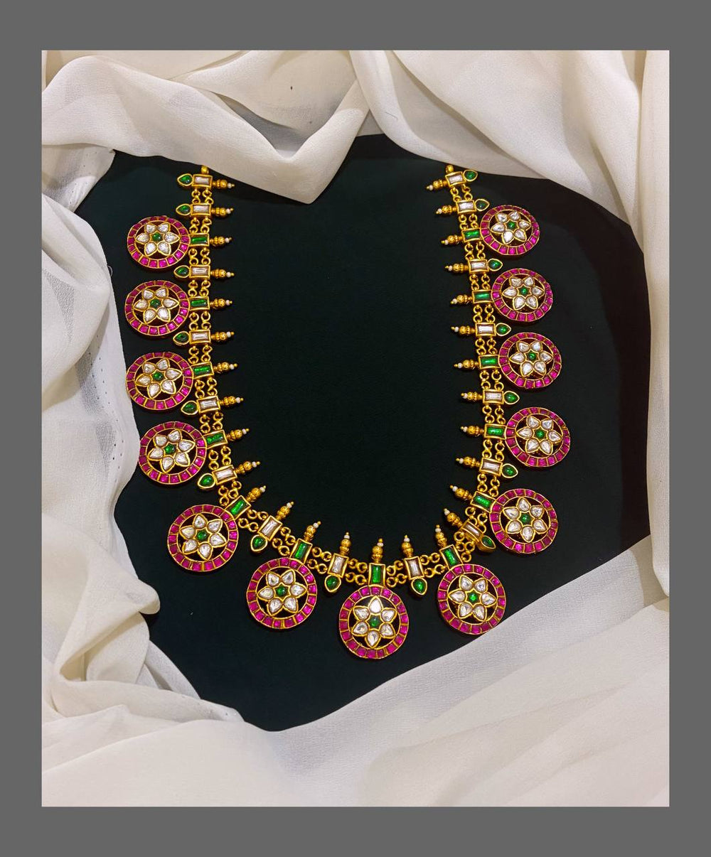 Introducing the Jadau Bottu Mala - KH00173, a stunning piece of traditional jewelry that adds elegance and cultural charm to any outfit. Handcrafted with intricate jadau work, this necklace boasts a unique design and impeccable craftsmanship. Elevate your style with this one-of-a-kind piece.