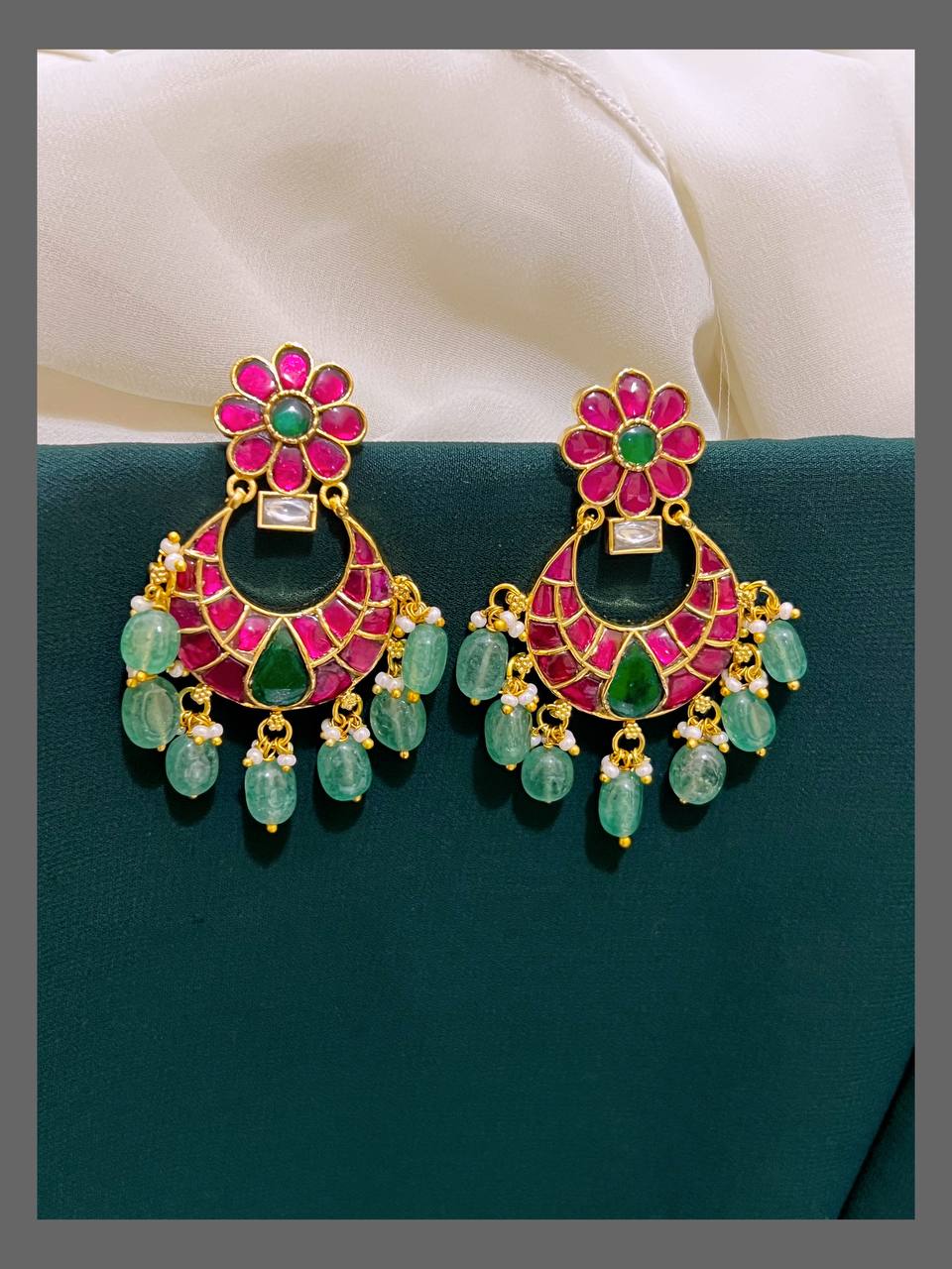 The Jadau Chandbali with Emerald Beads - KE00420 beautifully blends traditional craftsmanship with vibrant green emerald accents. This elegant piece offers a timeless design that enhances your special occasions with a touch of cultural charm and sophistication. Its intricate detailing and rich colors make it a standout accessory, perfect for complementing ethnic attire while adding a graceful and supportive statement to your jewelry collection.